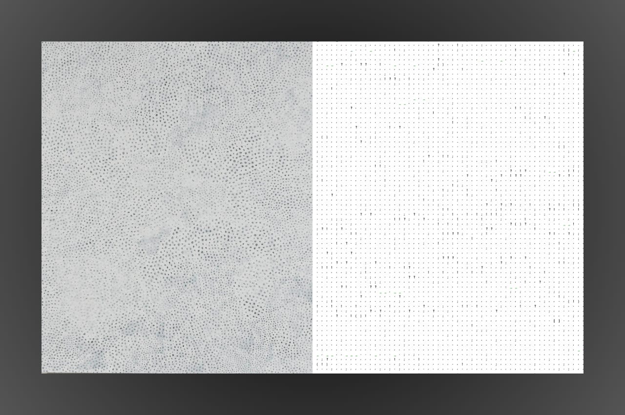 Yayoi Kusama’s paintings come to mind (the left-half of the cover image is an instance). The most minimal of marks, iterated and reiterated, thousands of times—her famed series of ‘infinity nets’— each repeating on the indifferent canvas: I was here and here and here and here…. Stepping back from these paintings, one is reminded of Nicholas Rougeux’s ‘punctuation charts’ which impasto’d the ‘visual rhythm of punctuation in well-known literary works’. For the right half of this post’s cover image, we applied Adam Calhoun’s Python script on Mary Shelley’s novel Frankenstein. Alphanumeric characters were removed, as were line breaks and spaces and only punctuation was retained.
